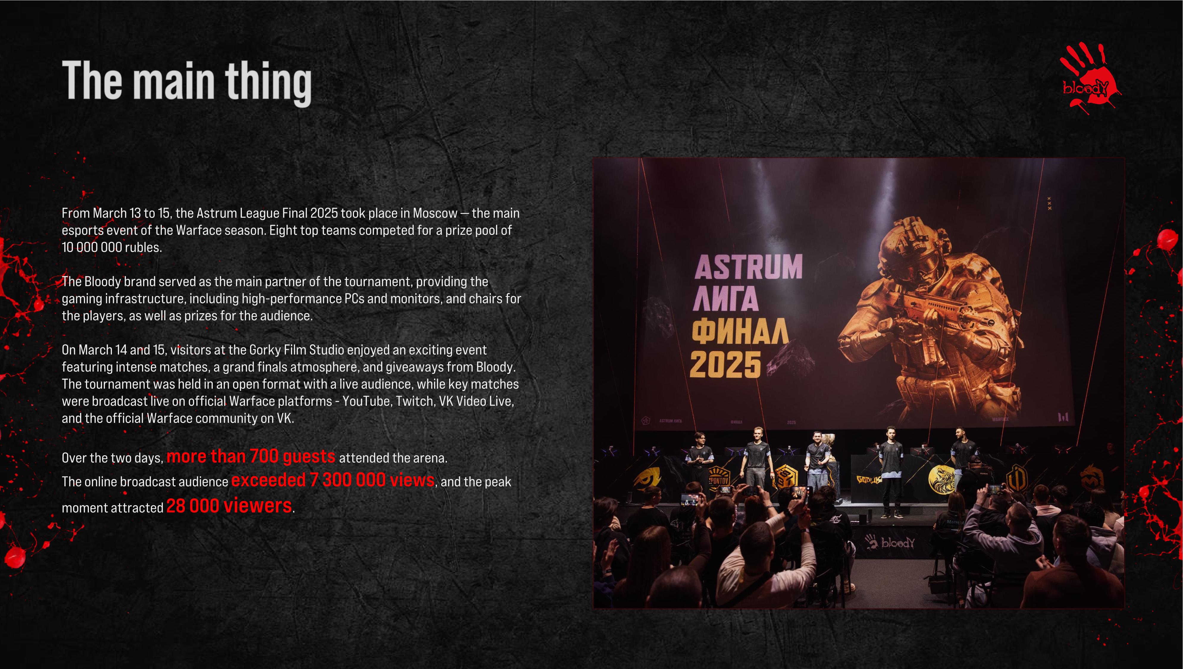Warface LAN Final, took place in Moscow from March 13 to 15 and was the key esports final of the Warface season, where Bloody acted as the main partner.